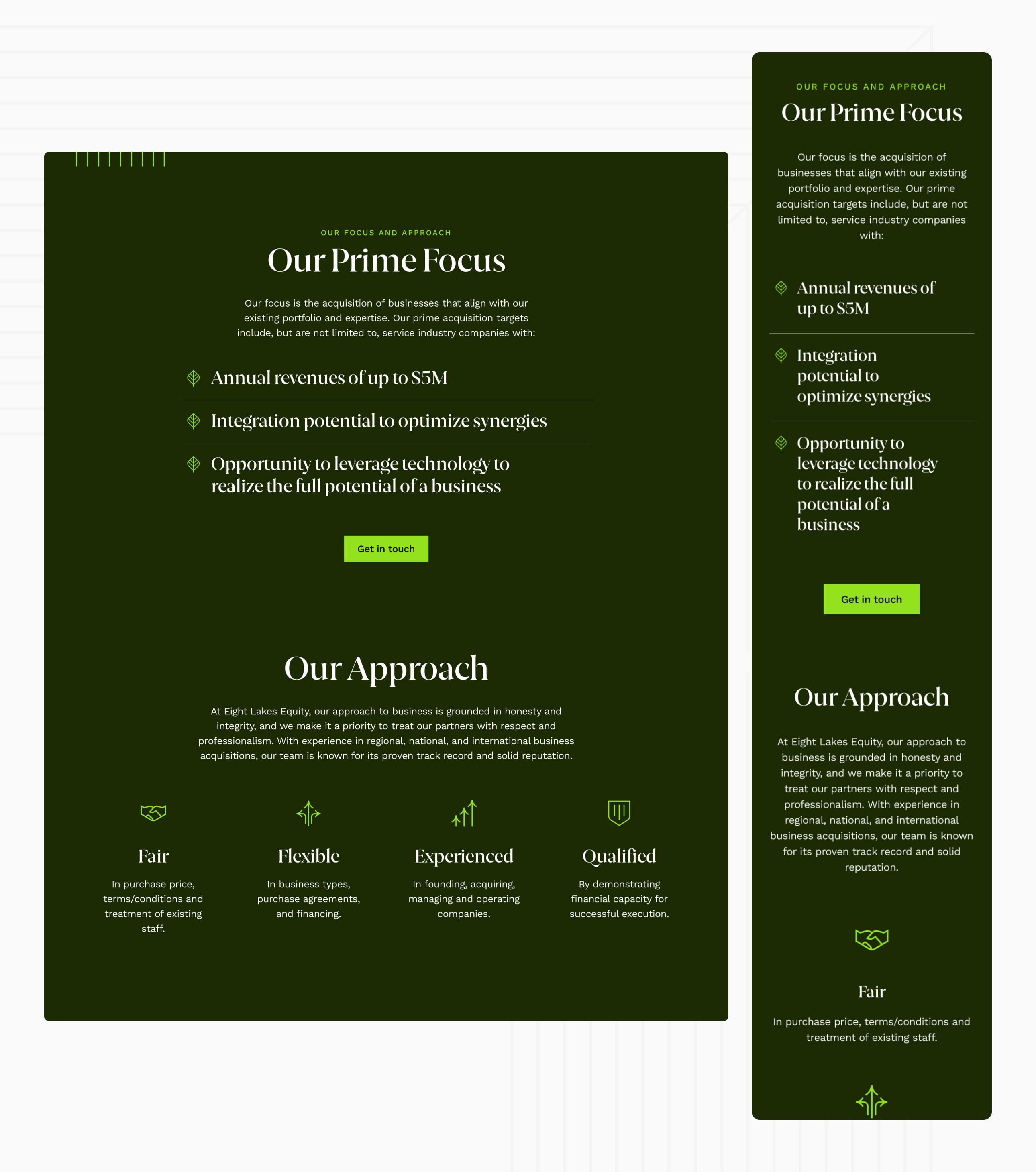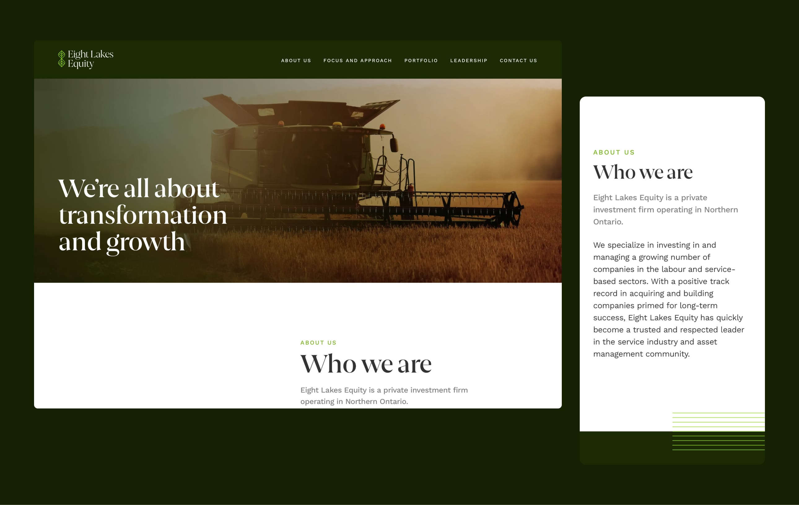 Eight Lakes Equity est une société nord-ontarienne d’investissement privé qui gère le portefeuille d’un nombre croissant d’entreprises spécialisées en main-d’œuvre et en services. La société nécessitait un nom et une image de marque qui reflète ses valeurs, mais qui démontre également la confiance et l’inspiration au cœur de son identité. On a conçu une marque avec deux feuilles entrelacées qui forment le chiffre huit – une métaphore visuelle qui évoque la croissance naturelle et des possibilités infinies. Cette marque formidable a été intégrée à une variété d’outils de vente dont un site web, des gabarits de présentation et du matériel promotionnel papier.