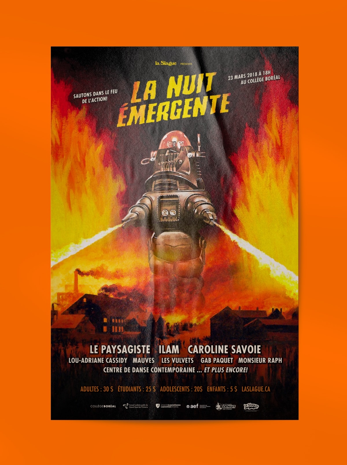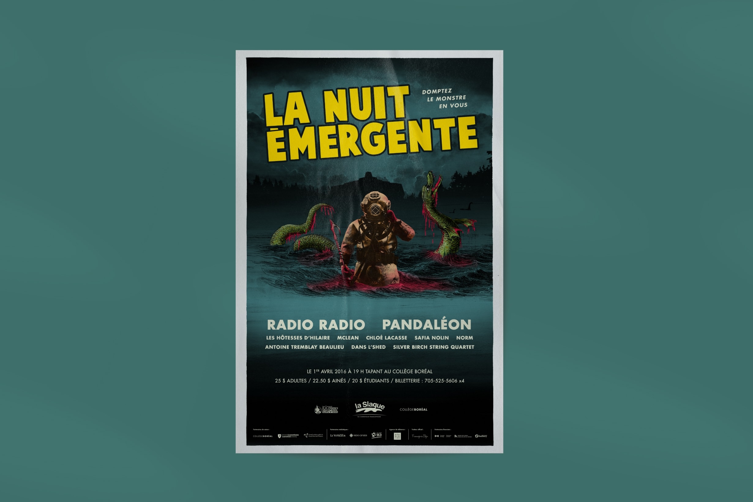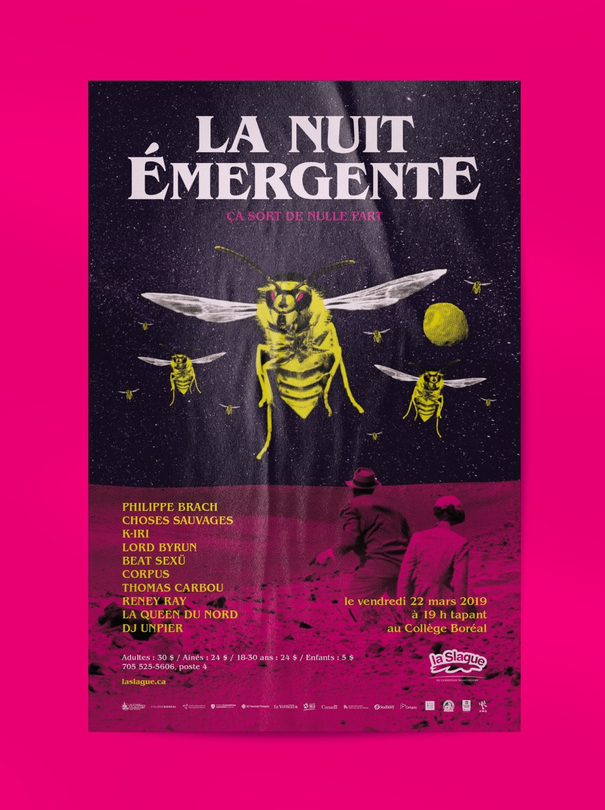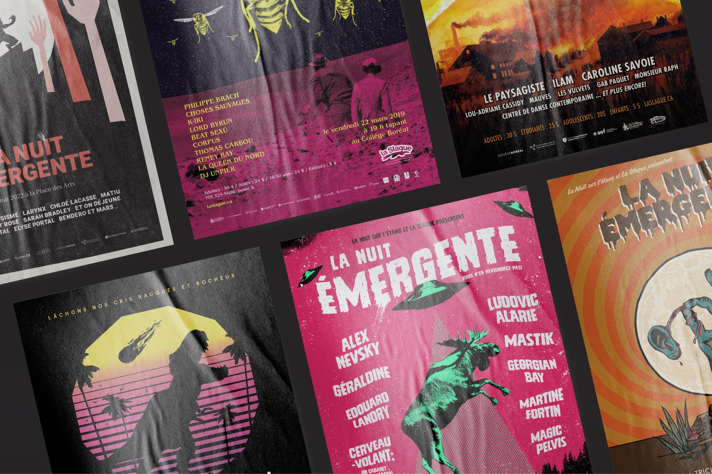 En collaboration avec l’équipe de La Slague, Studio123 en crée les monstrueuses images de marque depuis 2014. Chaque année, un nouveau sinistre suppôt devient le porte-étendard de l’événement et hante les spectateurs à travers de nombreux livrables dont des affiches, des bannières web, des fanzines, des animations, des lanières et de la signalisation. La combinaison de ces éléments crée une campagne immersive qui met la scène pour la Nuit émergente où la rencontre entre musique et mystère se déploie de manière inattendue.