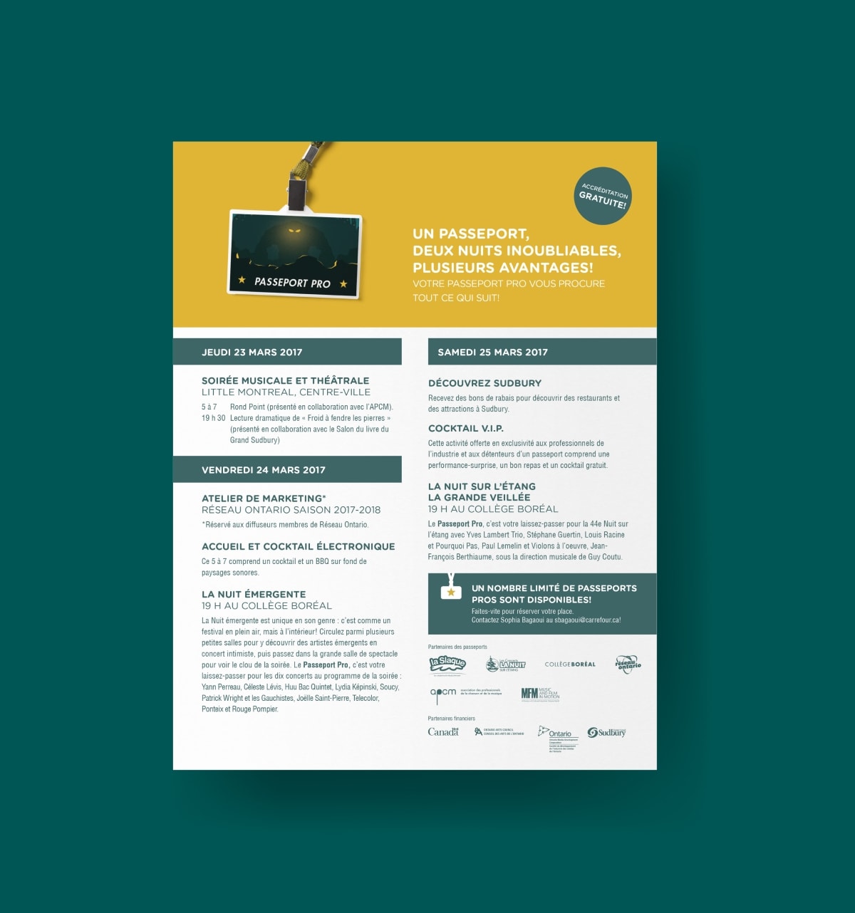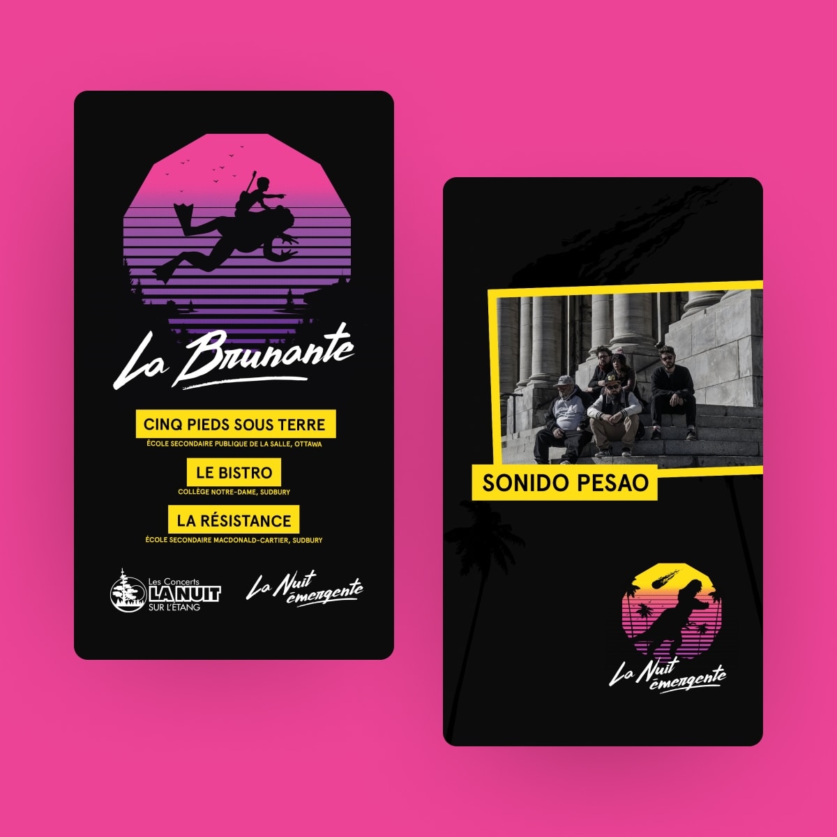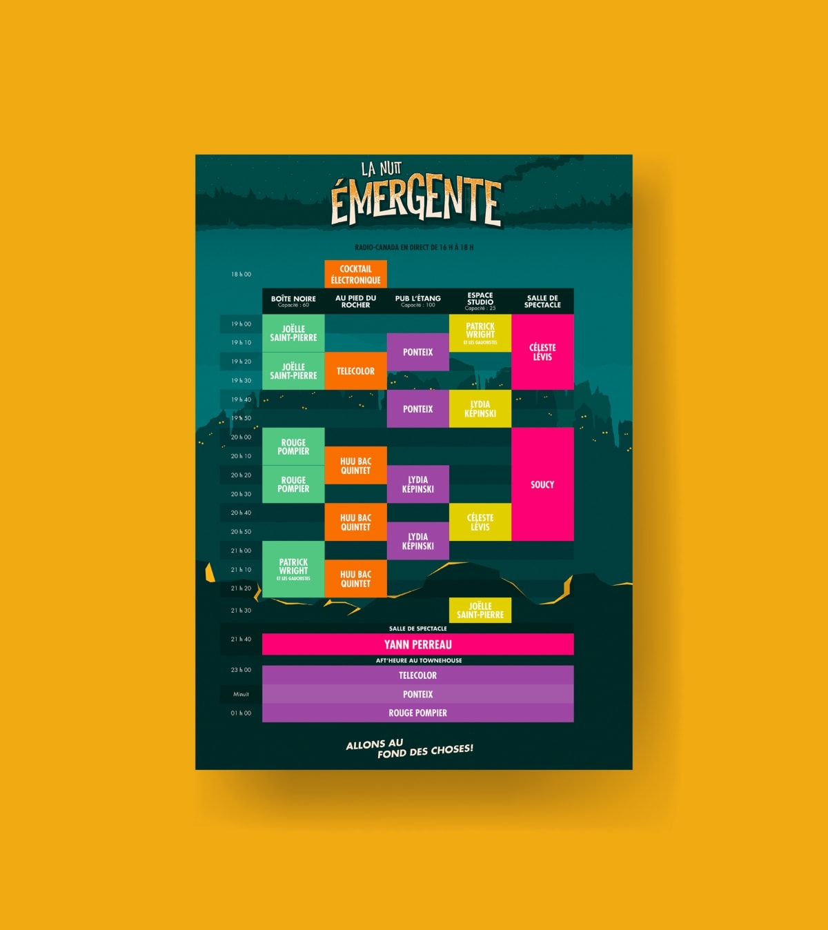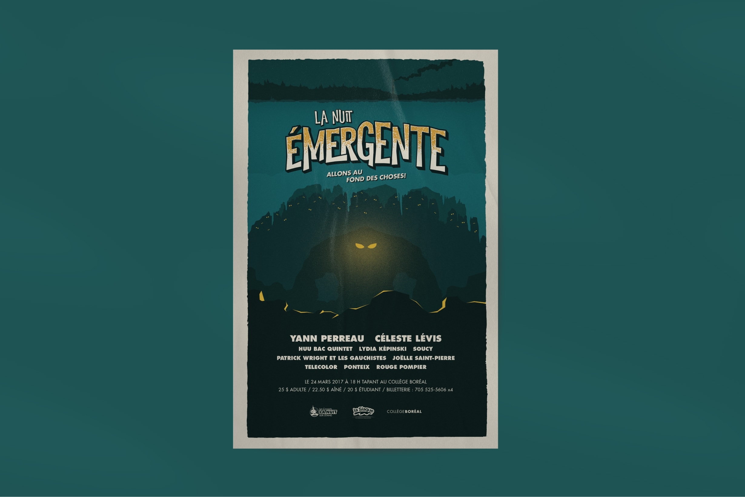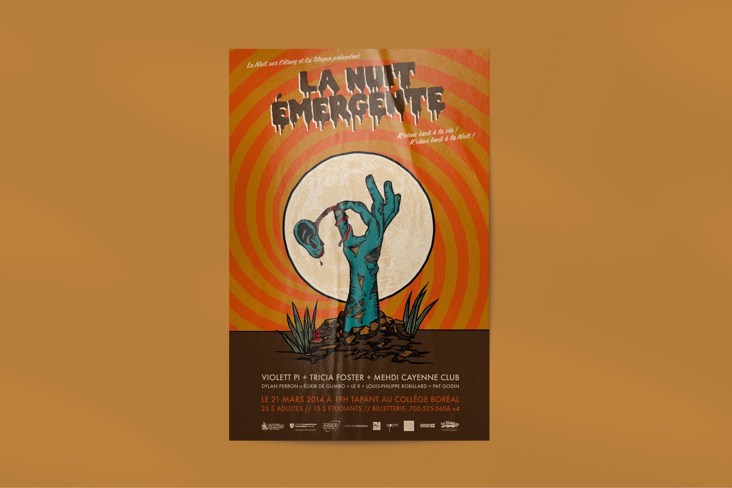 La Nuit émergente est une aventure musicale dont vous êtes maître et où il n’y a pas de mauvais choix. Elle réunit une variété d’artistes francophones émergents en provenance de l’Ontario et du Québec, et chaque mouture transforme une collection de lieux inusités en scènes intimes afin d’offrir une expérience musicale unique.