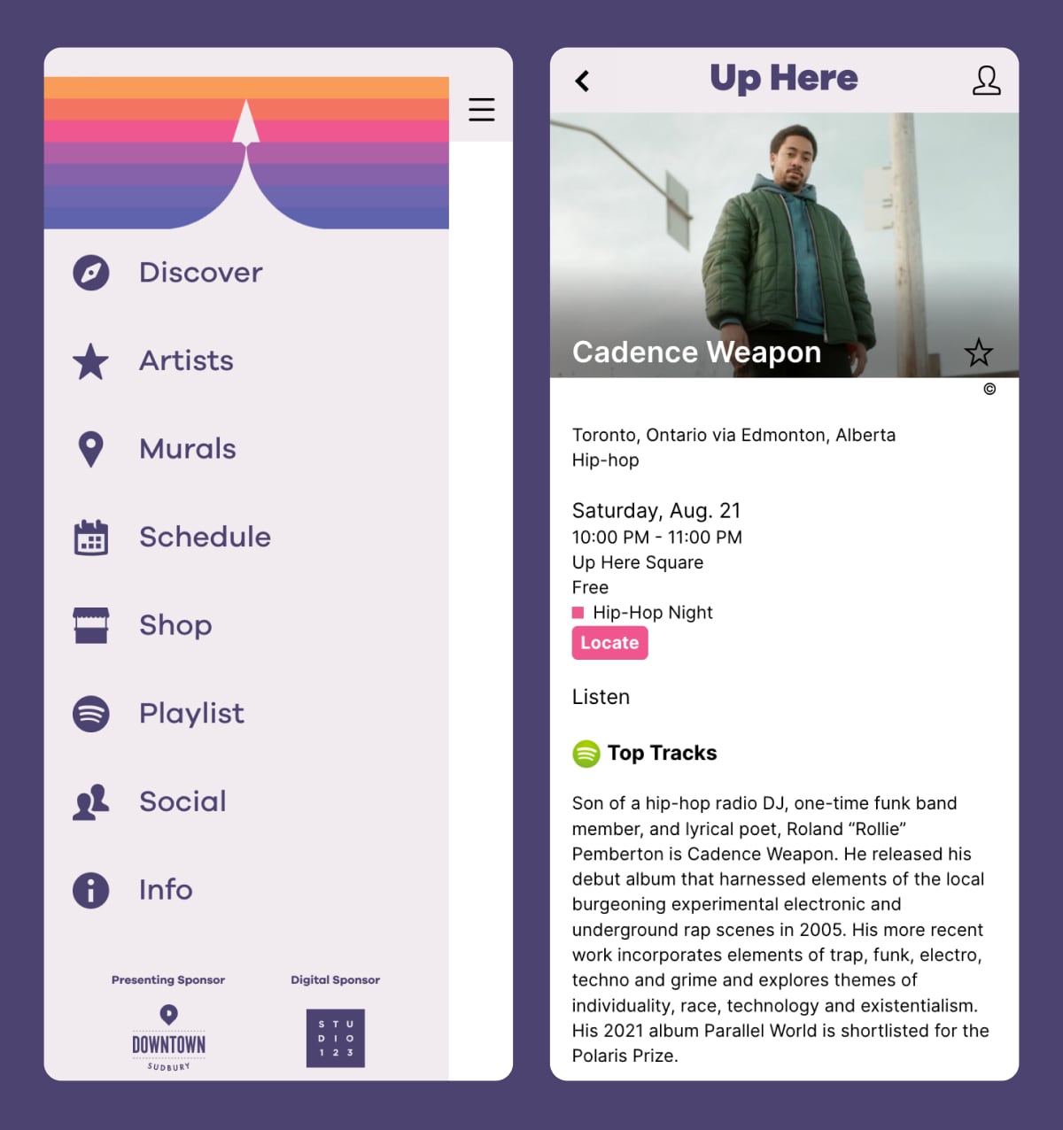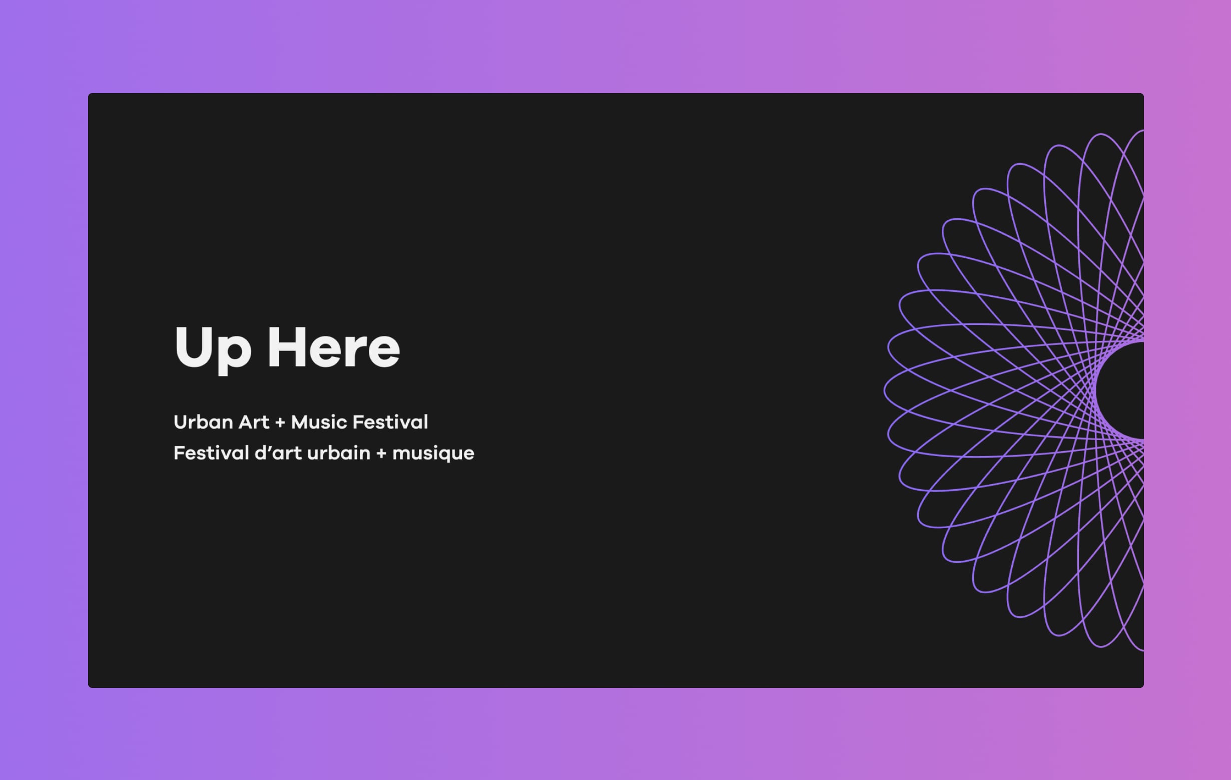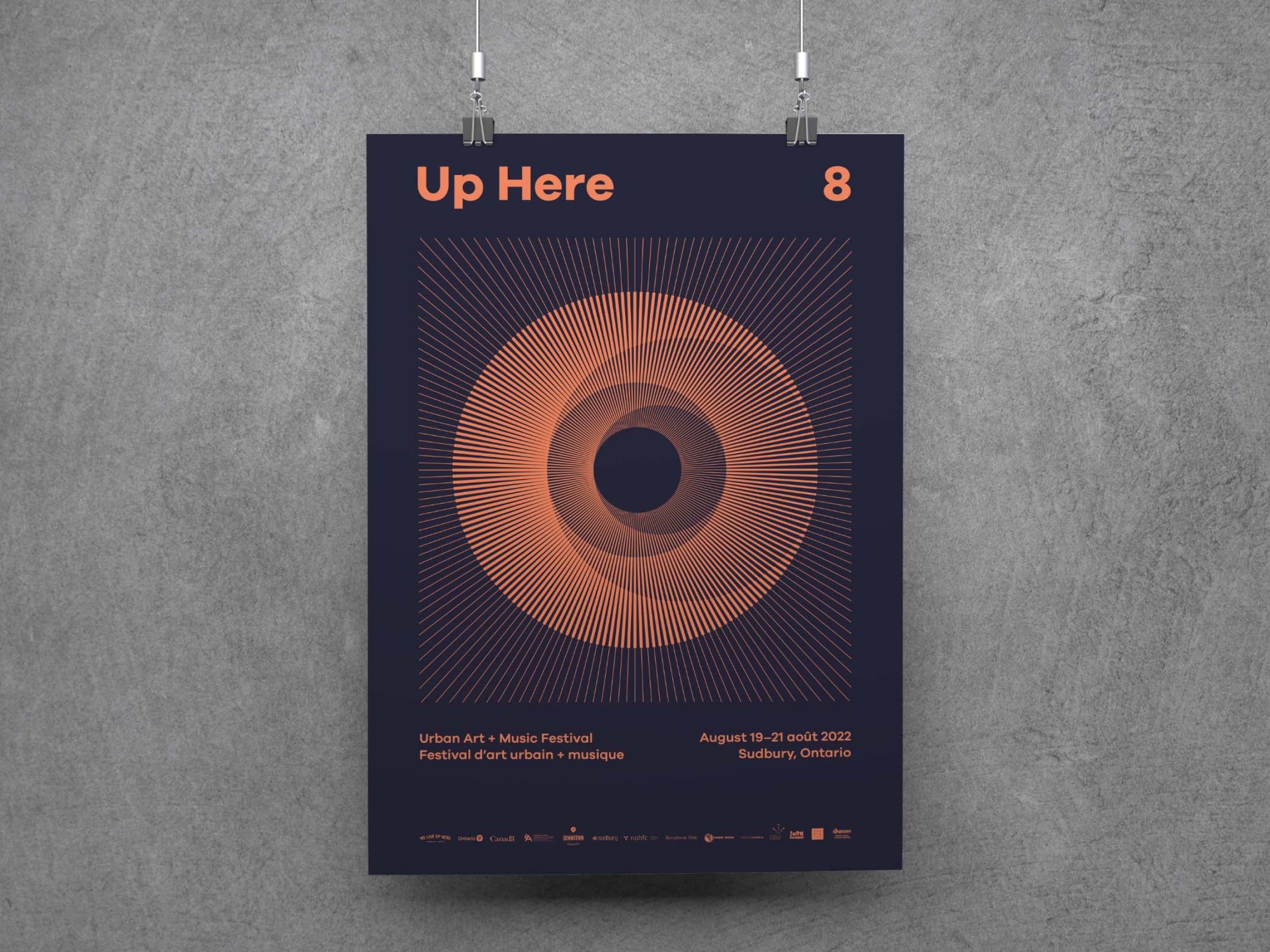 Up Here est un festival indépendant d'art urbain et de musique émergente qui a lieu chaque année dans l'étrange et curieuse ville de Sudbury, en Ontario. Chaque été, Up Here rassemble des dizaines de muralistes, de musiciens et d'artistes d'installation pour transformer le centre-ville de Sudbury en une galerie d'art urbain vibrante et captivante.