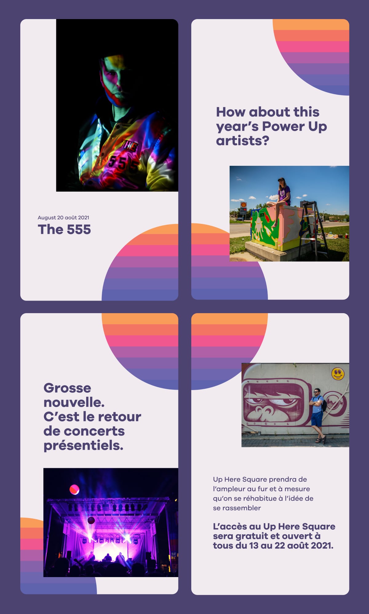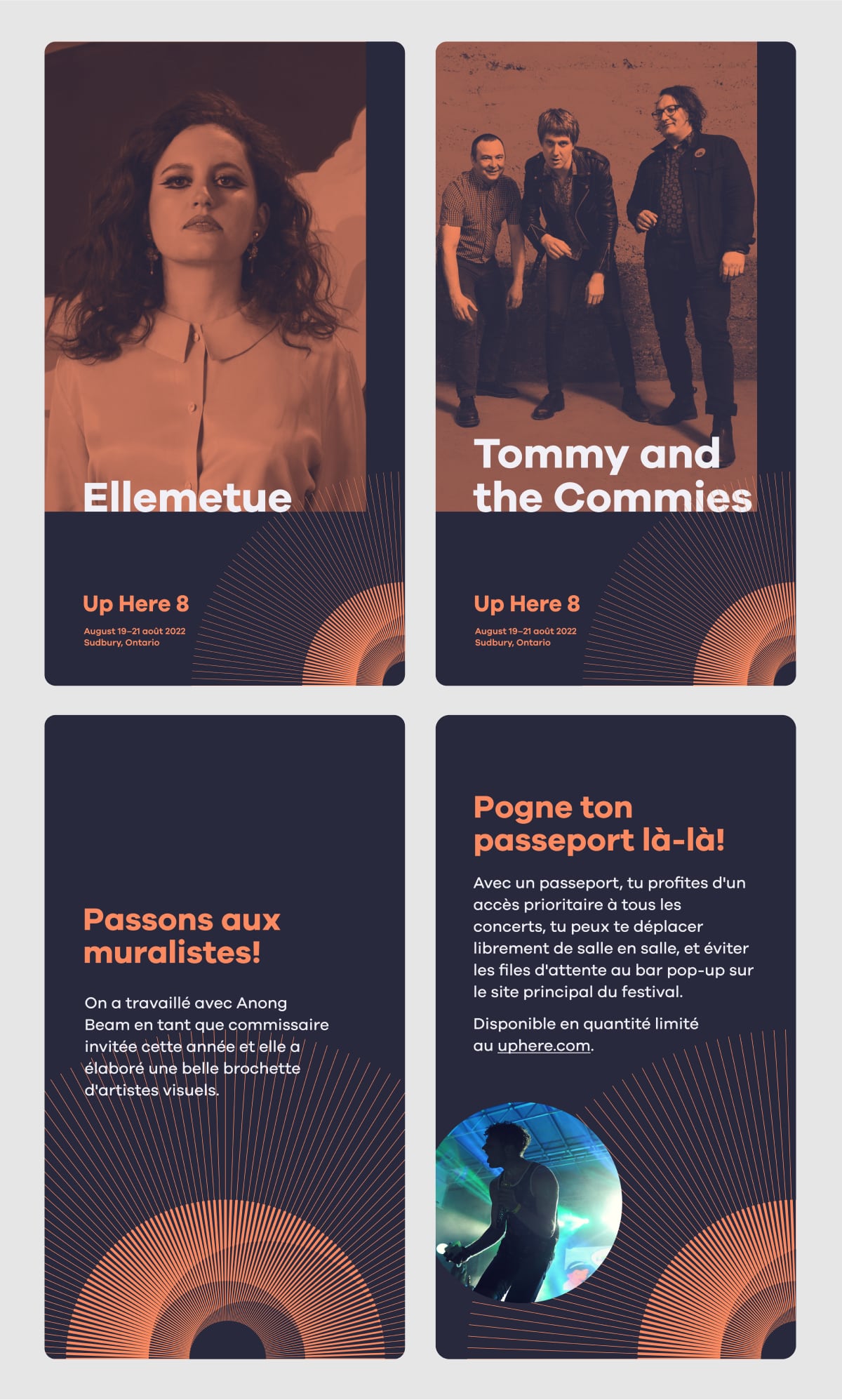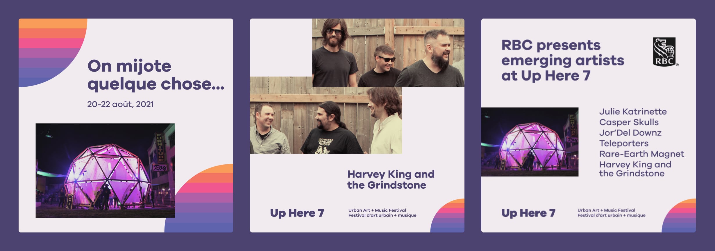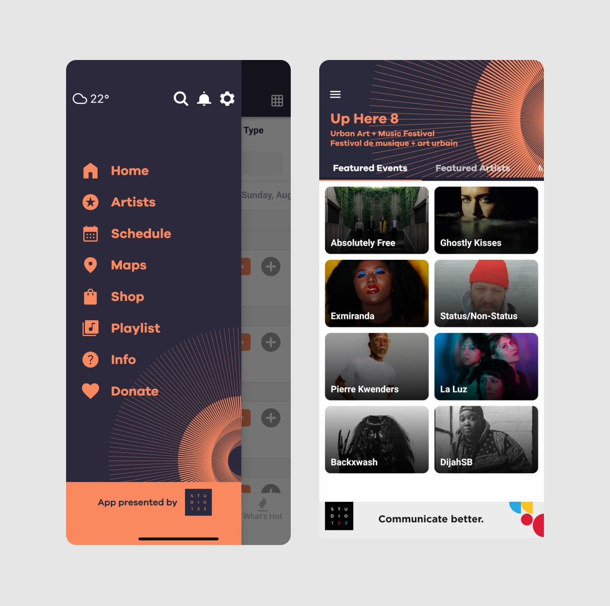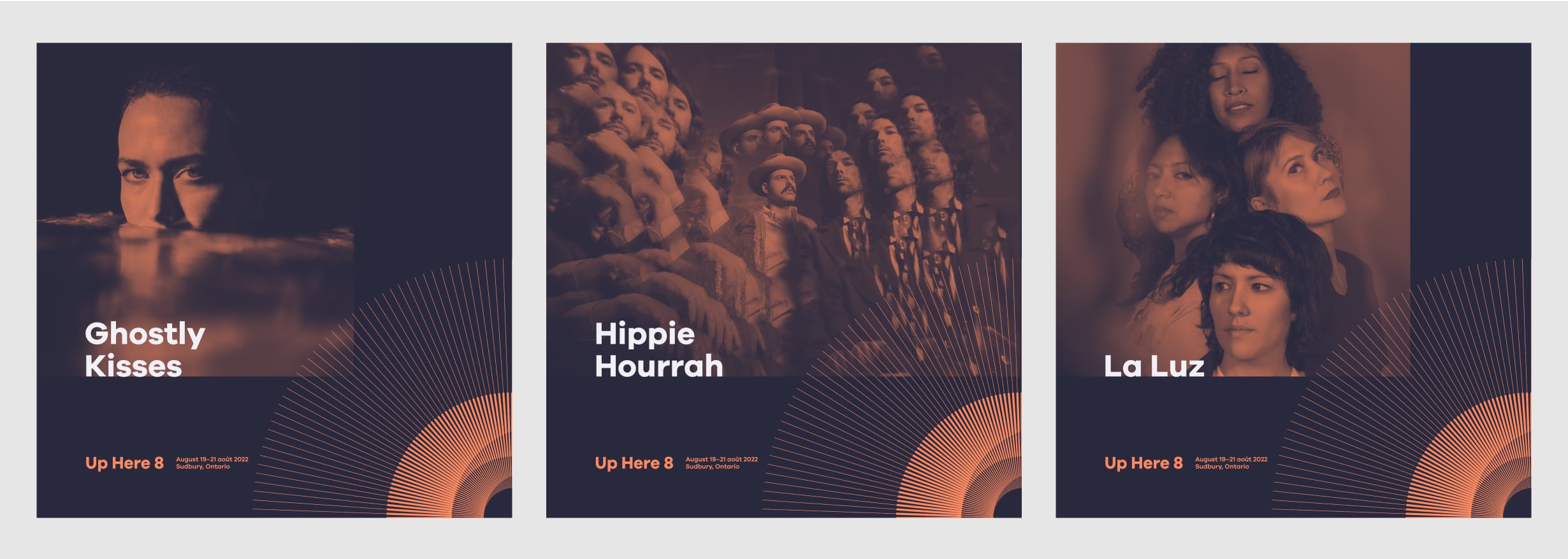 Studio123 collabore avec Up Here depuis 2020 pour créer l'esthétique audacieuse et moderne du festival. Notre travail comprend la conception d'affiches, de graphiques pour les réseaux sociaux, de la marchandise de festival, de signalisation sur place et du design de l'application de festival. De plus, Studio123 a dirigé des campagnes publicitaires régionales et nationales, contribuant ainsi à la popularité croissante de l'événement et à sa reconnaissance à l'échelle du pays.