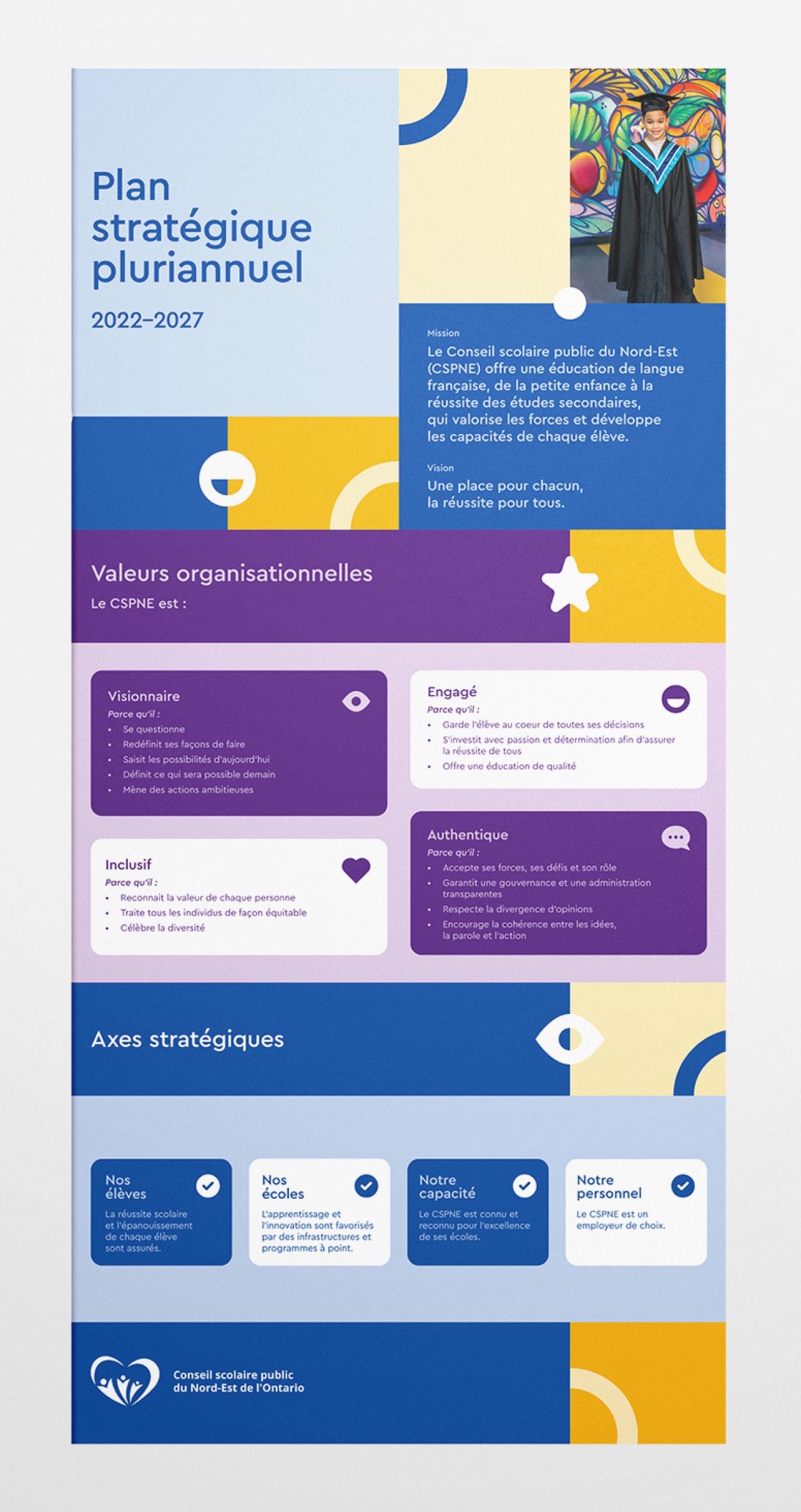 Conseil scolaire publique du Nord-Est de l'Ontario (CSPNE) provides French-language education from early childhood to high school across Northeastern Ontario. As agency of record since 2018, Studio123 spearheaded transformative projects to systemize CSPNE's marketing. This involved helping position the Board with clear messaging, developing an engaging and energizing brand system, and revamping school logos while addressing accessibility (AODA) issues.