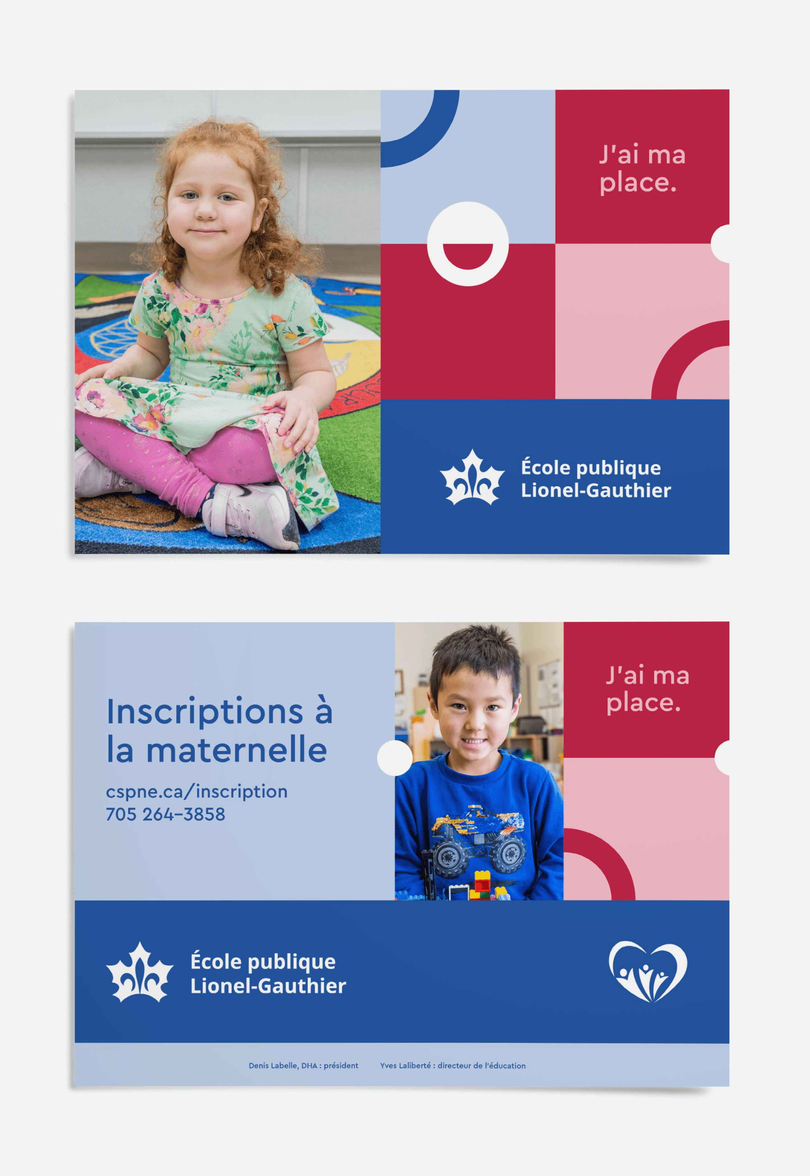 Studio123 conceptualized the J’ai ma place campaign, positioning CSPNE schools as welcoming learning environments for kids. A comprehensive branding system for the various regions, individual schools and the Board was developed, specifying grids, colours, typography, iconography, and brand elements. The robust colour palette, unique to each school while remaining connected to the board, establishes a cohesive visual language. This campaign's application spans various materials, including digital ads, social media graphics, newspaper ads, program guides, and annual reports.
