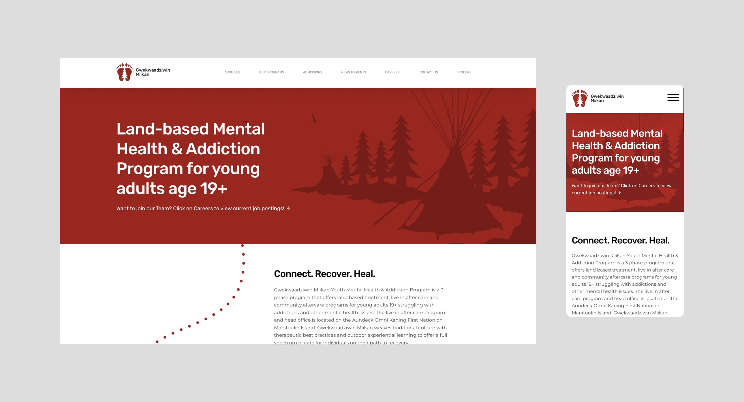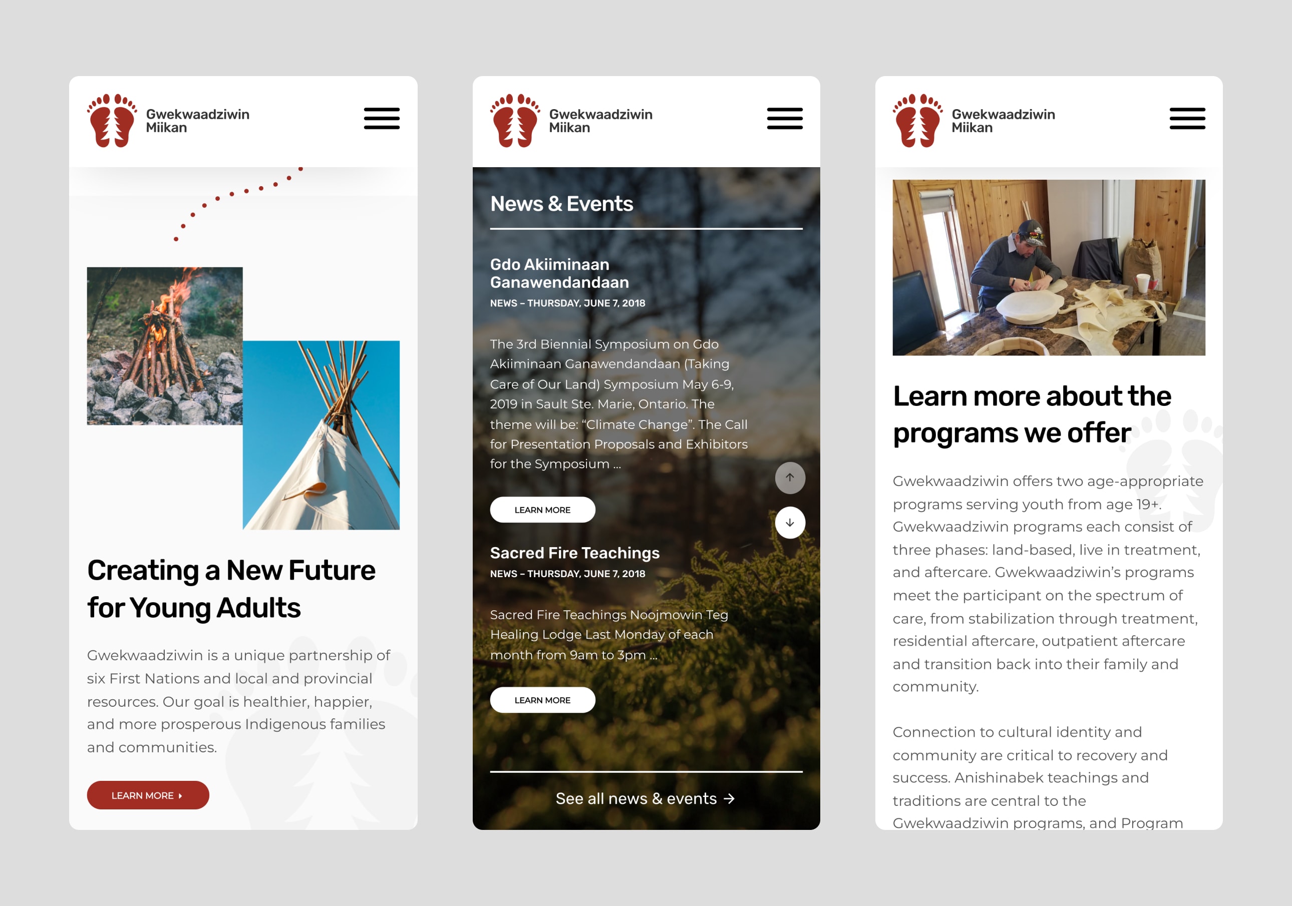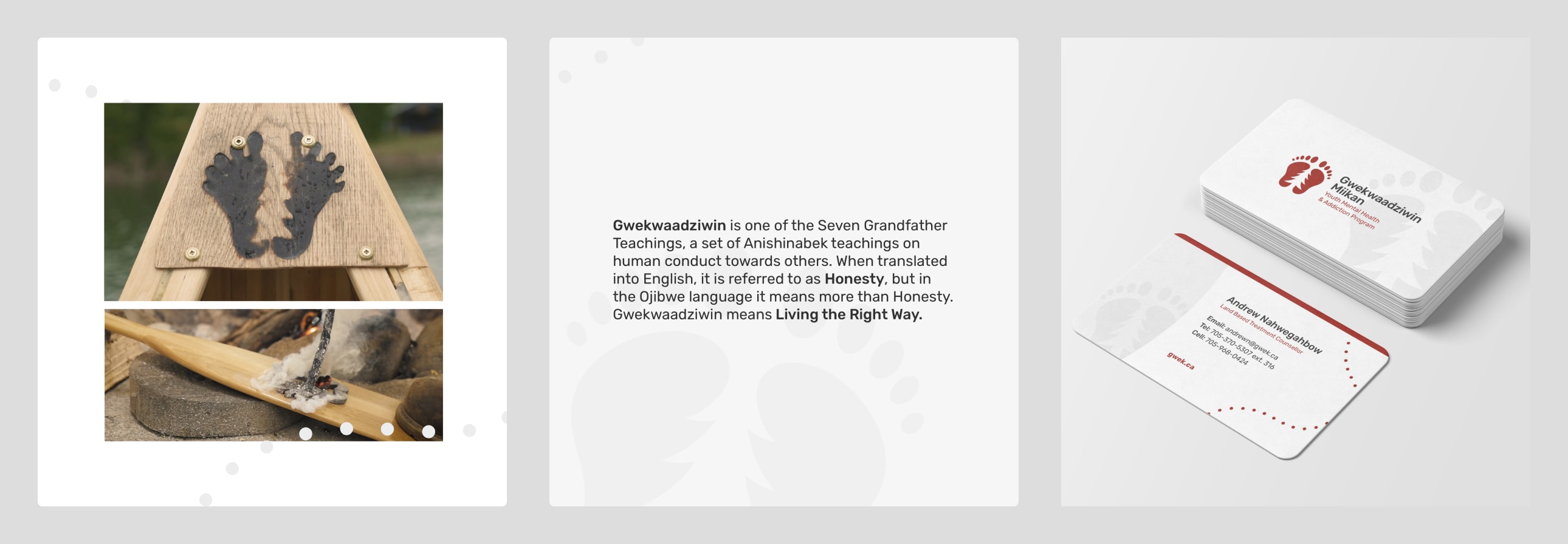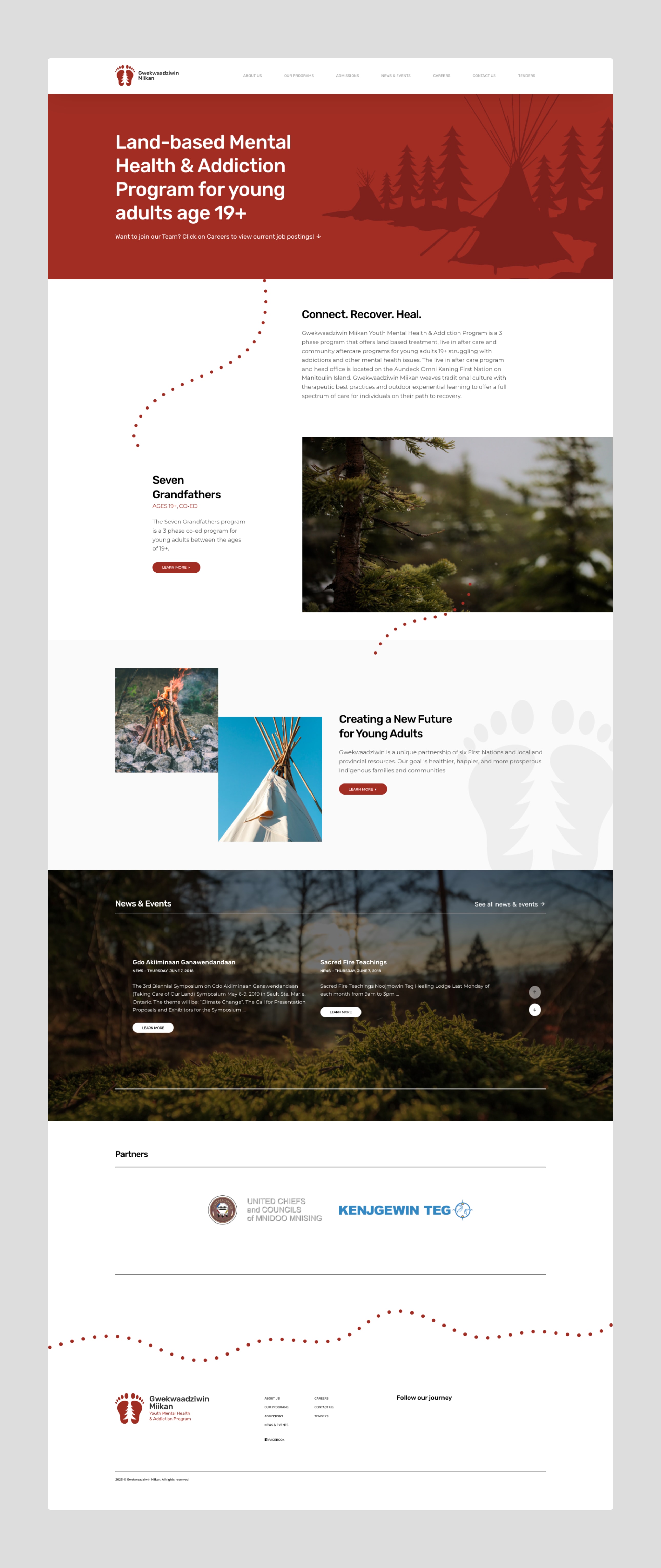 We collaborated with Gwekwaadziwin Miikan, to design their brand we refer to as "Standing Tall." Together, we created a website that reflects their land-based treatment programs and guides visitors with subtle animations. Our team then captured the essence of Gwek during a two-day shoot on Manitoulin Island. With a meaningful brand, and a website clean UI and a trusted feel, the creative work we completed for Gwek empowers people to walk the road towards a brighter future.